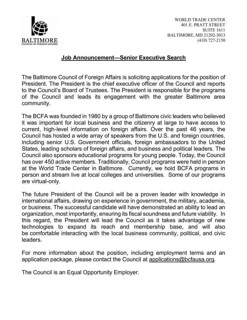The Baltimore Council on Foreign Affairs is dedicated to citizen education in foreign affairs. Membership is open to the public, with both individual and corporate plans available.